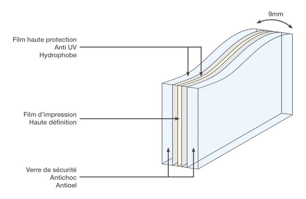 Notre procédé de fabrication est unique : la composition est imprimée sur un calque spécifique, inséré entre deux plaques de verre puis assemblé sous vide à haute température. Ce système innovant, que nous avons breveté, confère aux plaques une finition d’une qualité exceptionnelle.