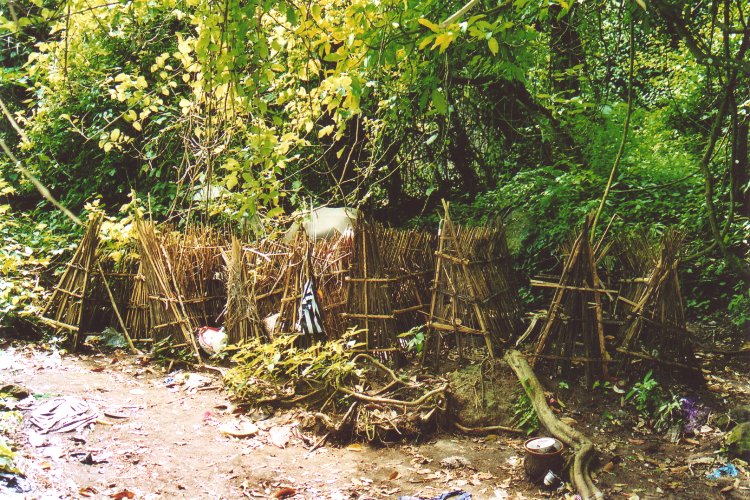 Les corps des défunts sont conservés directement sur le sol, entourés de tiges de bambous formant une cage pour les protéger des animaux et insectes pendant la décomposition des corps.