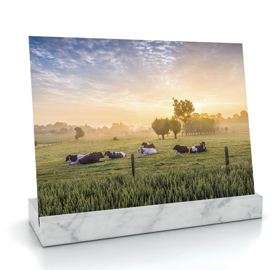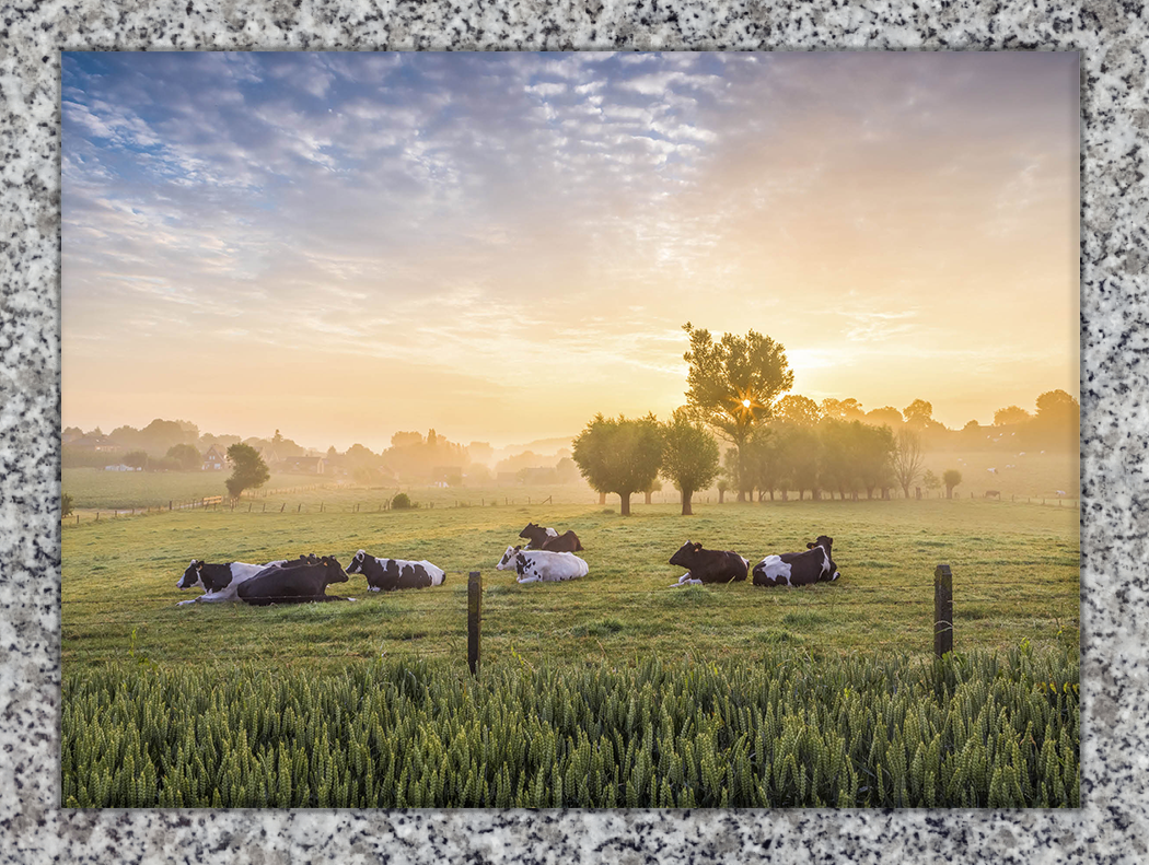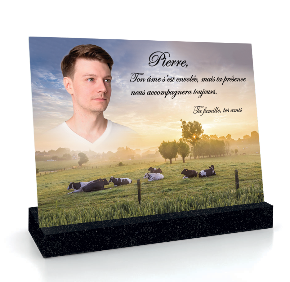 La plaque funéraire en verre « Vaches » offre un décor équestre pour rappeler l’importance des animaux et de la nature dans la vie du défunt.