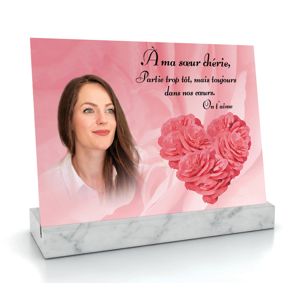 « Un coeur posé sur le temps » met l’accent sur la dimension durable du souvenir, à travers un décor cœur simple et élégant. Le visuel se marie facilement avec des textes courts comme des prénoms ou des dates, mais aussi avec des messages plus développés. La personnalisation vous permet de choisir le ton de l’hommage, qu’il soit poétique, sobre ou très personnel. Le support en verre garantit un rendu moderne et durable, qui s’accorde avec de nombreux styles de monuments funéraires.