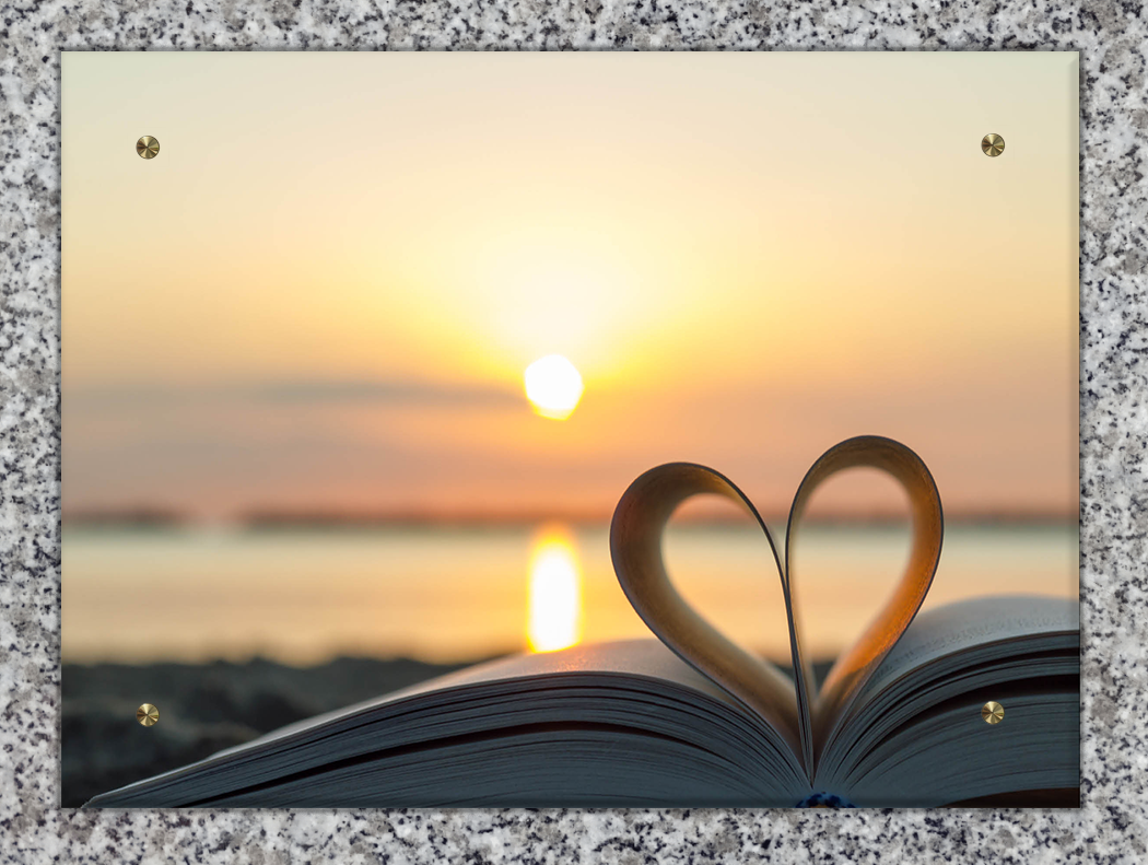 La plaque funéraire en verre « Les Pages du Coeur » évoque les souvenirs écrits au fil du temps, associés à la mer et aux moments partagés en bord de plage.