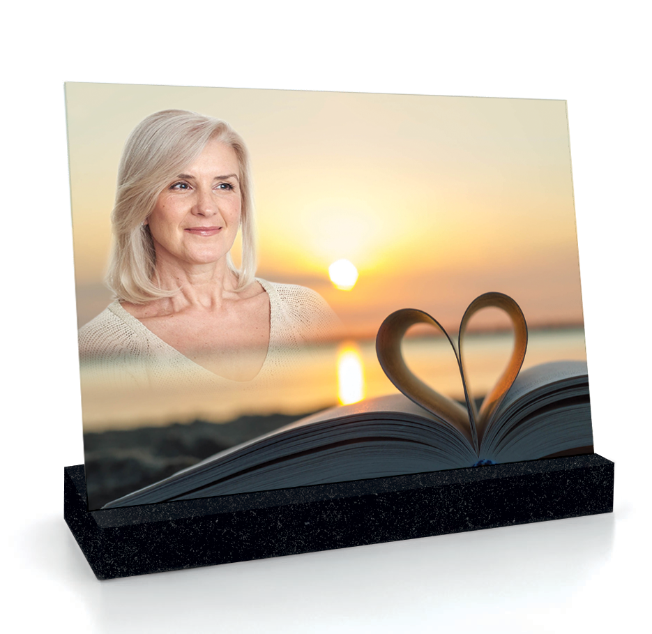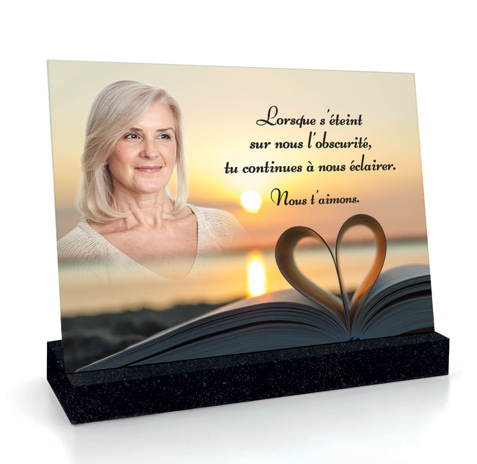 « Les Pages du Coeur » permet de mettre en avant les souvenirs écrits et les moments partagés, dans un décor de mer apaisant. Le thème du livre évoque l’histoire de vie du défunt, tandis que la mer rappelle les lieux aimés et les instants de détente. La personnalisation du texte vous laisse la liberté d’inscrire une phrase symbolique, une date importante ou un message plus personnel. Le support en verre garantit un rendu raffiné, qui se démarque des plaques traditionnelles tout en restant sobre.