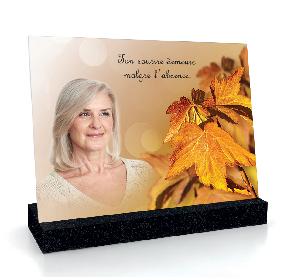 La plaque funéraire « Douce saison du souvenir » s’inspire de la nature et de ses saisons pour symboliser la continuité, le changement et la douceur du souvenir. Son décor floral ou végétal rappelle les jardins, les promenades, les fleurs préférées ou les paysages aimés par la personne disparue. La personnalisation vous permet d’ajouter un texte, une pensée ou quelques mots simples, ainsi qu’une photo pour ancrer ce souvenir dans une image concrète. Le verre français apporte une belle profondeur aux couleurs, donnant un rendu lumineux et délicat. Ce modèle convient particulièrement pour un hommage chaleureux, poétique et tourné vers la nature.