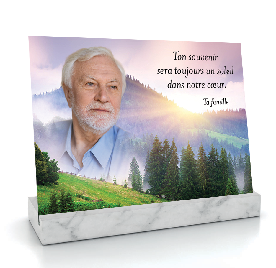 Son décor lumineux et symbolique se personnalise avec votre texte et votre photo pour un hommage plein d’espérance.