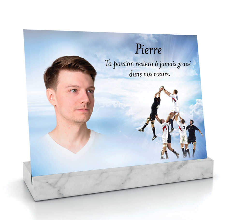 « Rugby » permet d’exprimer un attachement fort à ce sport, que le défunt ait été joueur, supporter ou bénévole au sein d’un club. Le décor sportif permet d’identifier immédiatement la passion qui l’animait, tout en restant élégant sur le monument funéraire. La personnalisation du texte vous donne la possibilité de rappeler un slogan d’équipe, une devise ou un moment marquant. L’ensemble crée un hommage vivant, qui parle aux proches et à tous ceux qui partageaient cette passion.