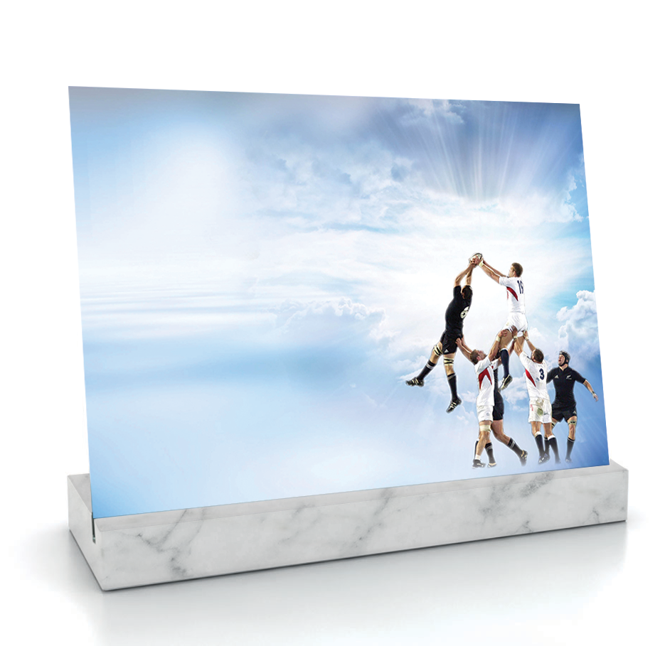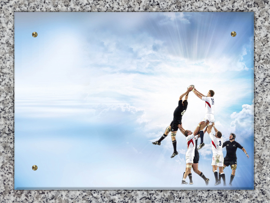 La plaque funéraire en verre « Rugby » célèbre la passion du terrain, de l’esprit d’équipe et du sport.